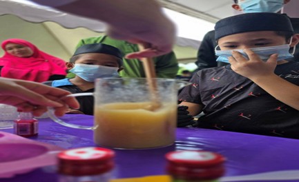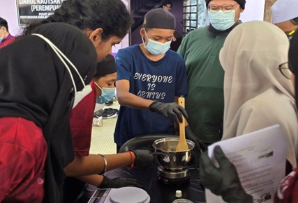Practical session (hands-on) on the preparation of scented soap by participants from Darul Kautsar orphanage under the supervision of facilitators, who are USM Toxicology students.